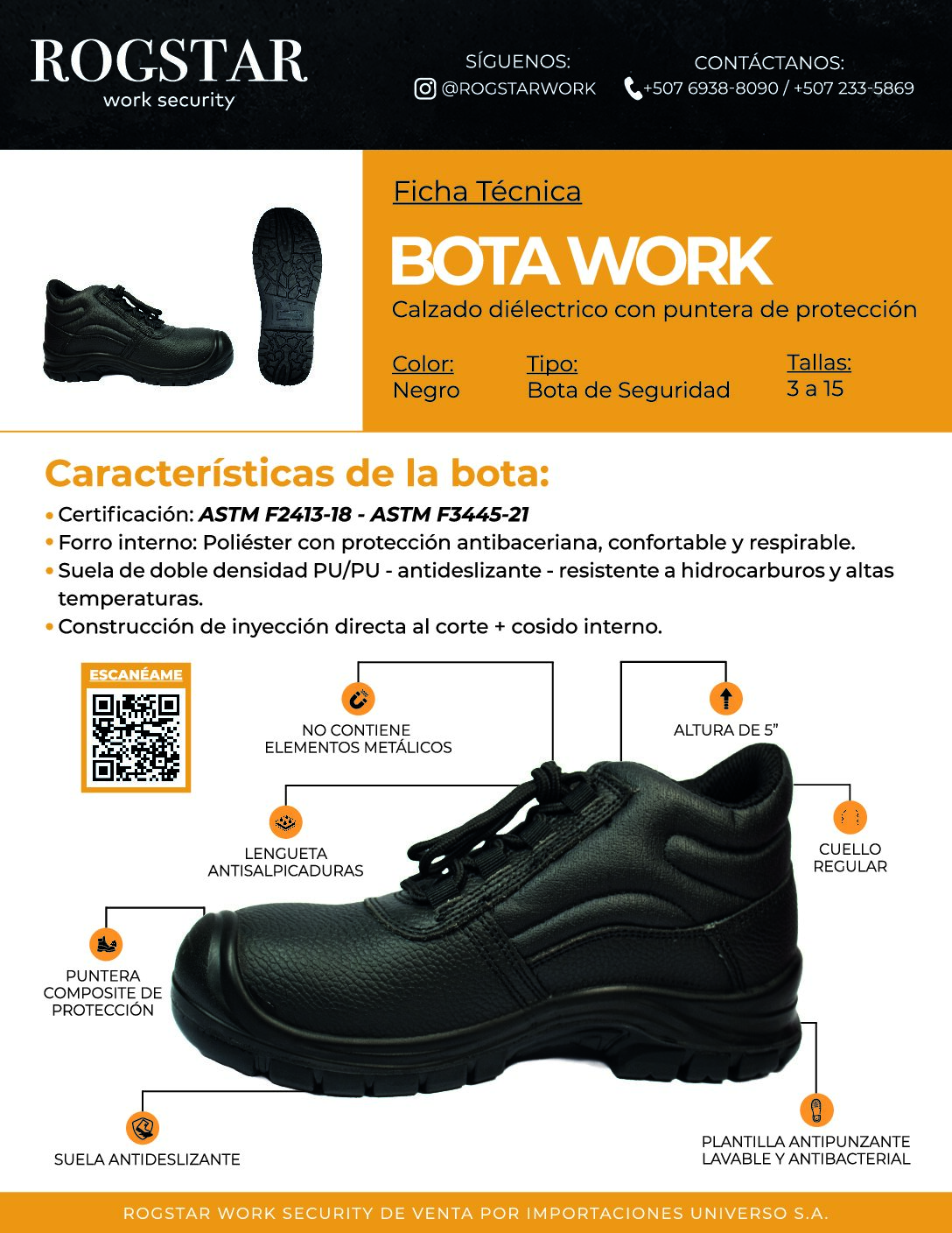 La bota Work combina tecnología de seguridad avanzada con materiales confortables y libres de metal, ideal para quienes trabajan en ambientes exigentes y requieren libertad de movimiento, protección y durabilidad.